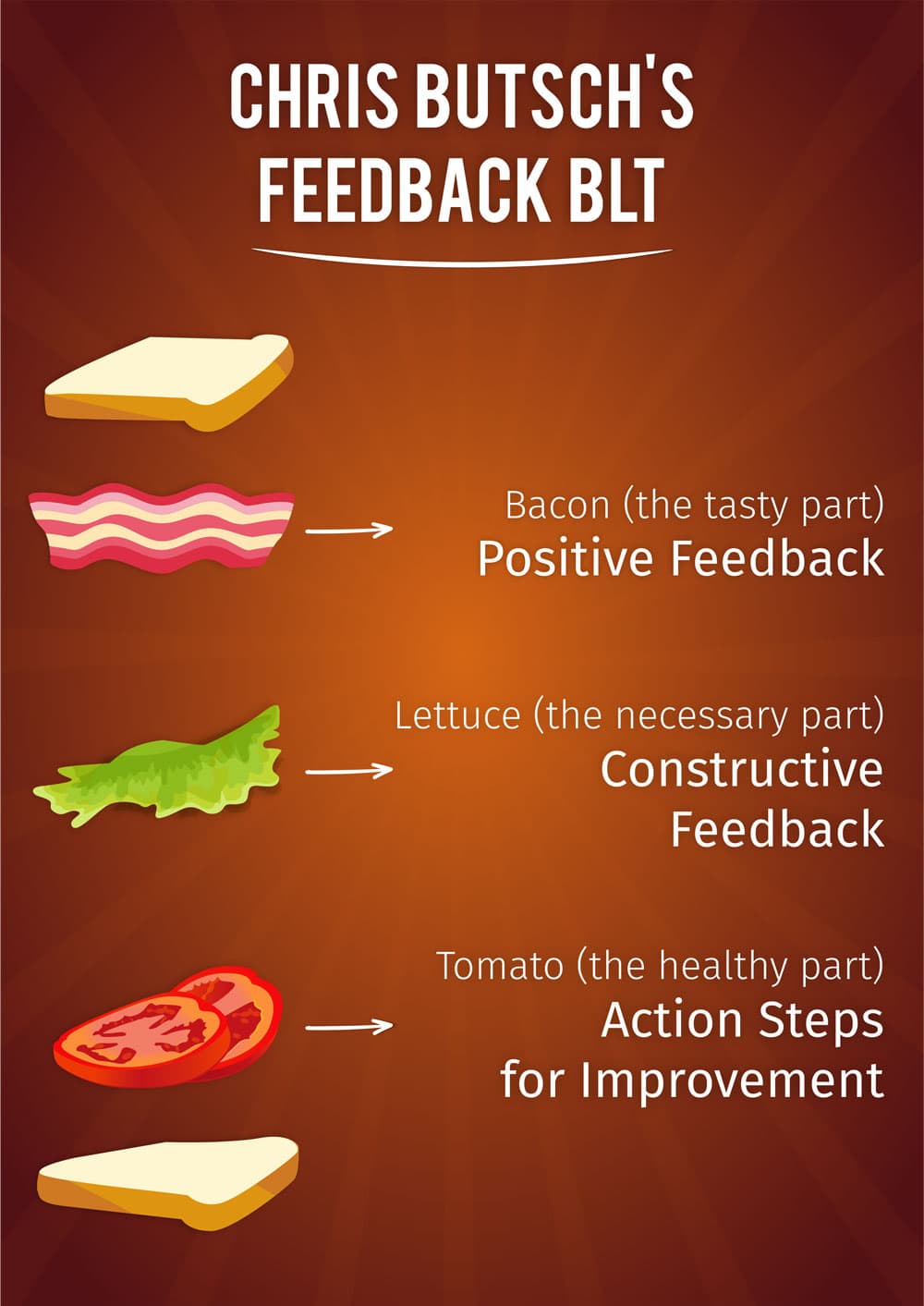 The format they follow is a significantly more effective version of the much-maligned “feedback sandwich.” Rather than give positive > negative > positive, they go positive > constructive > action steps. I label this method “The Feedback BLT,” since it starts with the tasty bacon, goes into the less desirable lettuce, and ends with the healthy tomato.